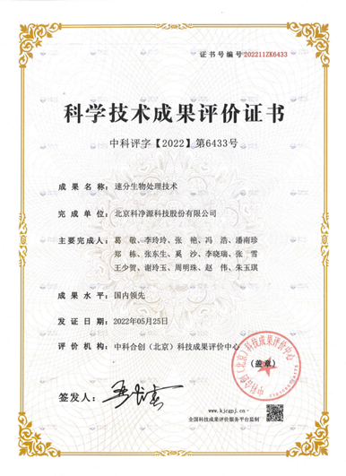 2022年5月20日,北京科凈源科技股份有限公司“速分生物處理技術”取得科學技術成果評價證書。